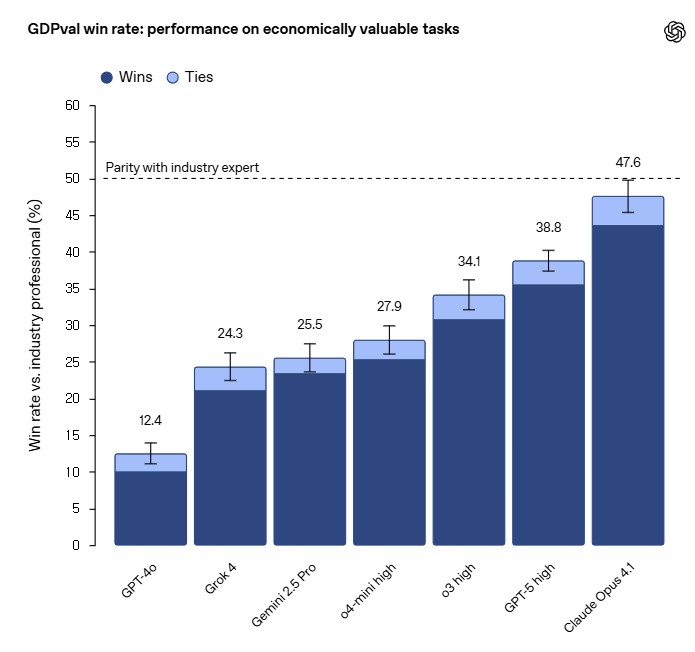 ๐ GDPval — ์ธ๋ฅ ์ต์ด "์ธ๊ฐ ์ ๋ฌธ๊ฐ ๋ฅ๊ฐ" ๋ฌ์ฑ