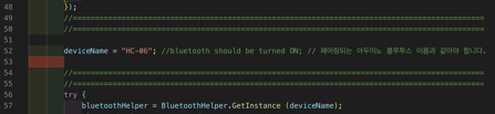 Manager.cs를 열어서 deviceName 을 위에 아두이노 설정시 변경했던 블루투스 이름과 동일하게 수정해줍니다.