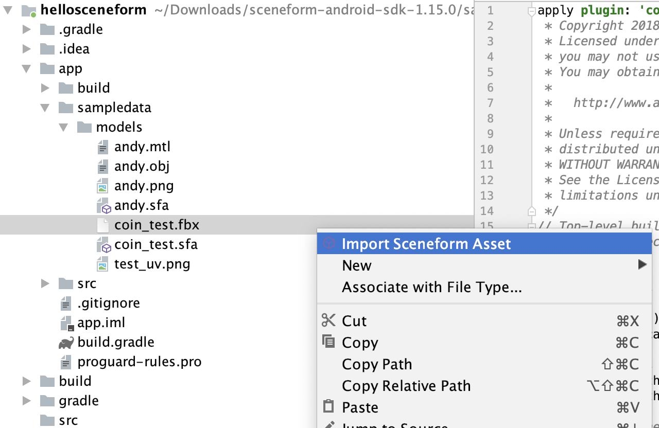 Learn how to import 3D models, convert them into Sceneform format, and preview them in Android Studio. Note: To import and work with 3D models in Sceneform, ensure you have installed the Google Sceneform Tools (Beta) plugin. Import a new 3D asset Sceneform