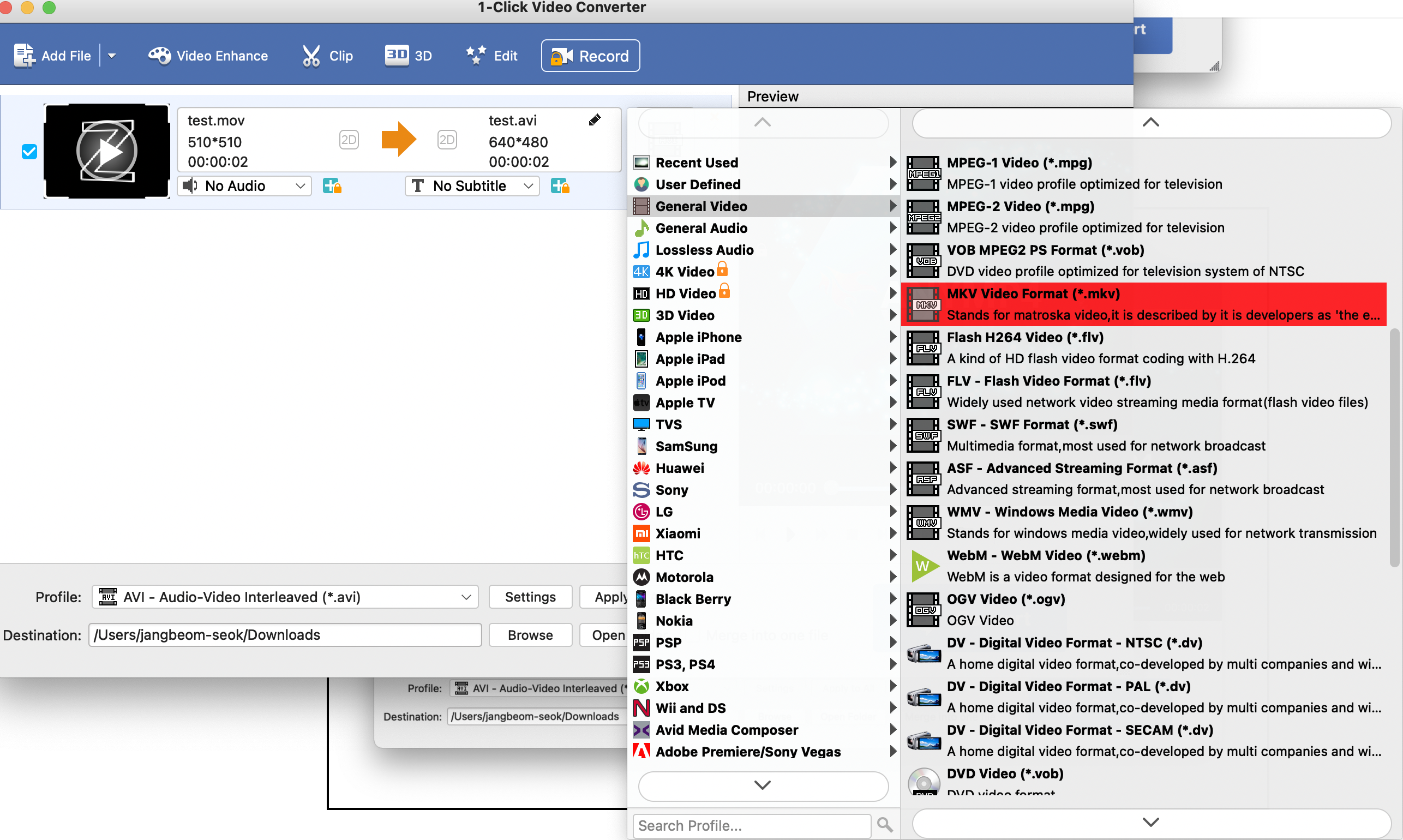 불러온 파일 오른쪽에 아웃풋 영상을 선택할 수 잇는데 클릭. (캡쳐화면에는 AVI라는 아이콘)